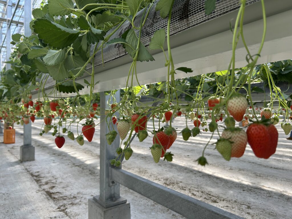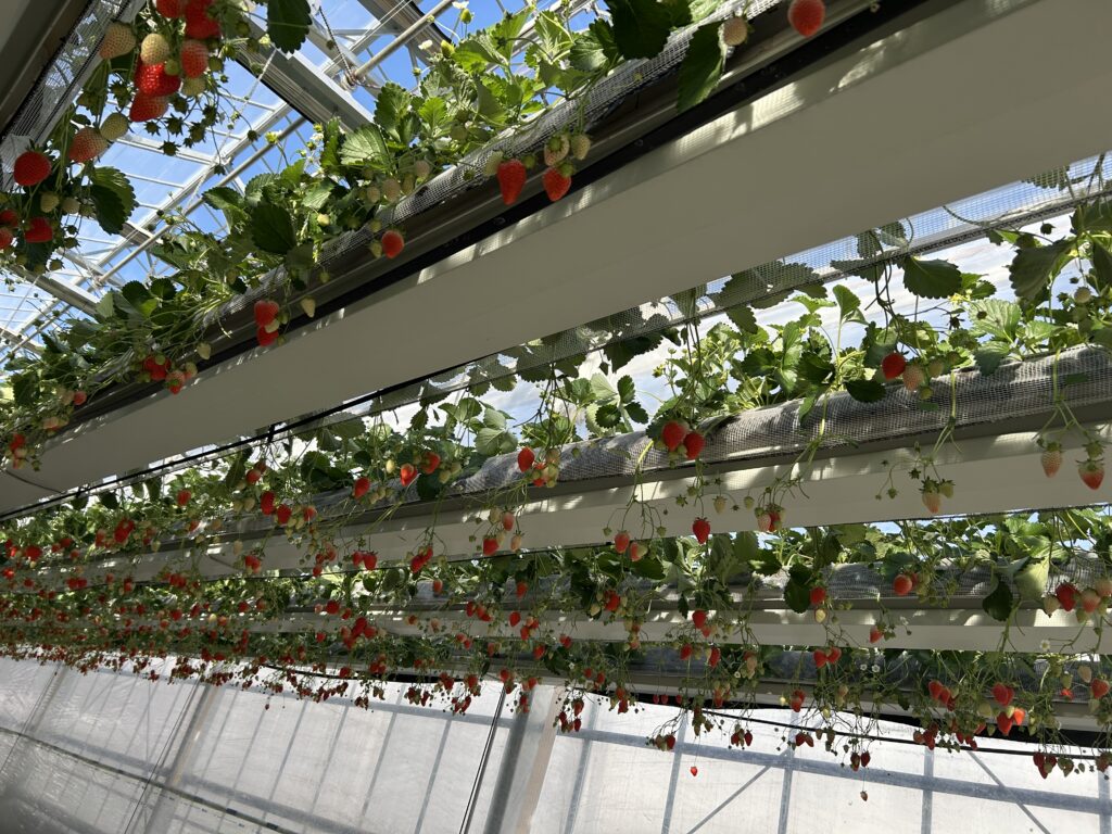 イチゴが宙に浮いている「空中イチゴ園」